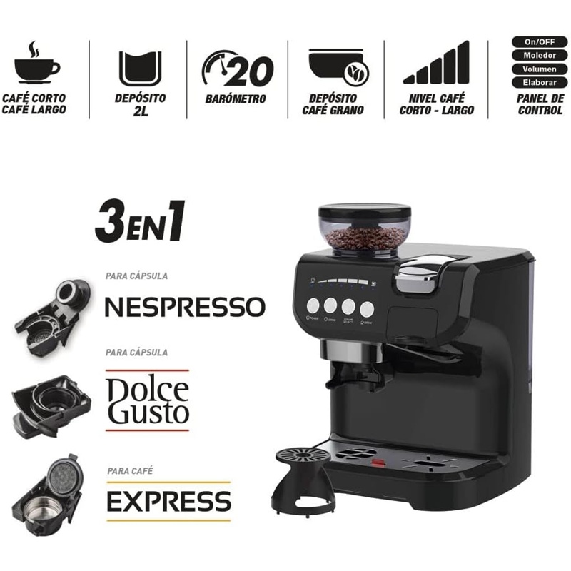 La Cafetera Superautomática Bilake 20 Bares 2L cuenta con una capacidad de 2 litros de agua, diseñada para preparar café de manera automática. Su sistema de presión alcanza hasta 20 bares, lo que permite una extracción eficiente del café. Este modelo incluye un molinillo incorporado que permite utilizar granos de café en su estado natural. La máquina es compatible con café en grano y disponible para el uso de café molido. Tiene diversas opciones de preparación, incluyendo espresso y café largo. Su panel de control es digital, lo que facilita la selección de diferentes funciones y configuraciones. También incorpora programas de limpieza y descalcificación. Su depósito de agua es extraíble, lo que facilita su llenado y limpieza. La cafetera posee una bandeja de goteo que permite la recolección de líquidos residuales. La parte frontal está diseñada para facilitar el acceso a los componentes principales, como el molinillo y el depósito de café. La Cafetera Superautomática Bilake 20 Bares 2L se conecta a una fuente de alimentación estándar y cuenta con un sistema de apagado automático.