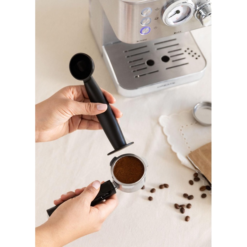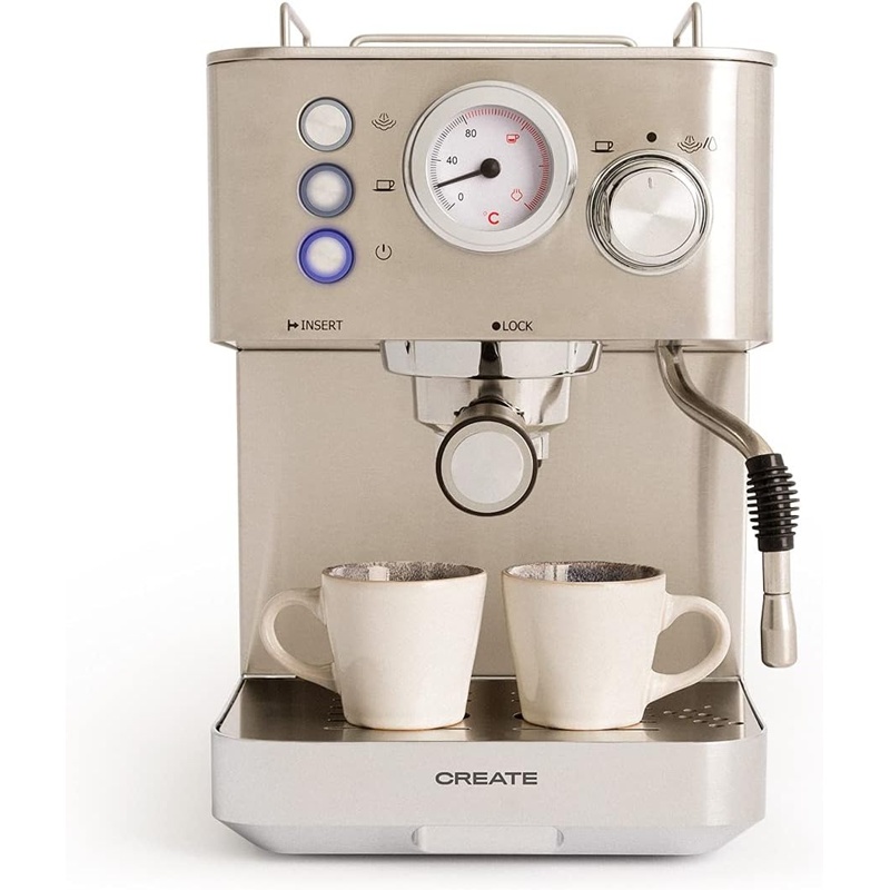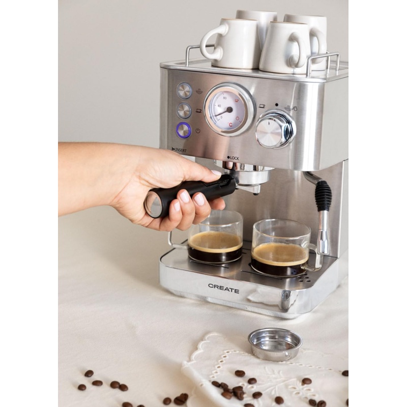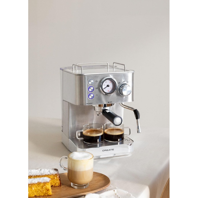 La Cafetera Express Semiautomática CREATE THERA 20 Bares está fabricada en acero inoxidable y utiliza un sistema de presión de hasta 20 bares para la extracción del café. Incorpora un termorregulador y una olla de calentamiento para controlar la temperatura. Incluye un grupo de café y un portafiltro de 58 mm, así como dos salidas para preparar dos tazas. Su sistema de vaporización y desagüe es desmontable. Dispone de un depósito de agua y es compatible con café molido y cápsulas.